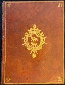 , dos à nerfs avec pièce d’arme répétée, triple filet en encadrement autour des plats avec fleurette aux coins, armes au centre, double filet doré sur les coupes, roulette intérieure dorée, tranches marbrées (Reliure de l’époque).