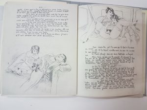 Édition en fac-simile d'un texte très libertin rédigé, librement illustré en gris bleu dans le texte, gravé et édité par Léon. Courbouleix c. 1935.