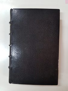 Plein maroquin, dos à nerfs orné, tête dorée, champs filé, double roulette dorée , double page de garde de papier, coiffes ciselées.