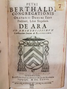 BERTHAULT (Père) – [Des Autels.] - Petri Berthaldi Congregationis Oratorii Domini Jesu, presbiteri, Liber Singularis, De Ara, Ad Eminentissimum Cardinalem Ducem de Richelieu. — [Nantes] - Nannetis, ex Officina Petri Doriou, Regis & Academiae...