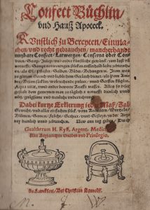 RYFF (Walther). Confect Büchlin, und Hauß Apoteck. Kunstlich zu Bereyten, Einmachen, und recht gebrauchen, mancherhandt nutzbare Confect, Latwergen, Conserva oder Conditen, Sirop, Julep, und andre künstliche getränck... Frankfurt, C. Egenolff,...