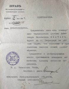 Удостоверение Командующего Морским флотом в Петрограде от 12 апреля 1917 года, № 21274; машинопись, печать Штаба Черноморского флота, подписи Капитана 1 ранга Николая Ивановича Смирнова и Начальника отделения Старшего Лейтенанта […]
