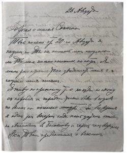 Дорогая и милая Сонечка. Твое письмо от 20-ого августа я получил но, Ты не пишешь мне получила ли Ты мое письмо посланное по почте. Я много раз просил ранее меня уведомлять меня о получении моих писем. Я живу по прежнему т.е. никуда не схожу с корабля и иногда только бываю в городе по делам на несколько минут. […] Все твои предположения о веселом времяпровождении и ухаживаниях за дамами неосмотрительны. Сегодня я снялся, не знаю, что получиться. Для этого у меня нет времени. Я даже до сих пор не был в своем дворце и на даче -не могу найти свободного часа. […] В отношении дам, чтобы ты успокоилась могу, сообщить что со мной произошла странная вещь-дамы все перестали нравится после моего отъезда в Черное море. Твой любящий Александр … »