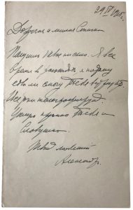 « Дорогая и милая Сонечка. Получил твое письмо. Я все время в разъездах и поэтому, едва ди смогу тебя встретить. Все таки телеграфируй. Твой любящий Александр ».