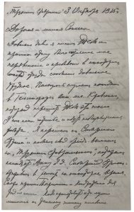 Lettre manuscrite adressée à Sophie Koltchak et son fils du cuirassé «Tourkmenetz-Stavropolsky», 3 octobre 1915, encre noire, 2 f., 4 p.