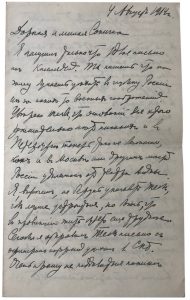 « Дорогая Сонечка. Я получил твое письмо из […] Ты пишешь, что на зиму думаешь уехать в глубину России из-за каких-то военных соображений. Уверяю тебя, что основан для этого решительно нет никаких и в Петербурге теперь такие же безопасно, как и в Москве или в другом месте России, удаленных от театра войны Я, впрочем, не берусь указывать тебе, где лучше устроится, но боюсь, что в провинции жить будет еще труднее. Сегодня я отправил тебе письмо с офицером, который уехал в СПб. Очень прошу не поддаваться панике и понять, что следует иметь сообщение со мной,пока это возможно […]