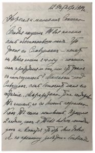 « Дорогая и милая моя Сонечка. Сегодня получил твое письмо очень обеспокоившее меня. Что тако скучилось со Славушком - понять из твоего письма я не могу-напиши […] что такое с ним случилось? Маленький мой Славушок, очень беспокоят меня его страдание. Маргариточка тоже не здорова […] как ты сама поживаешь […]