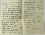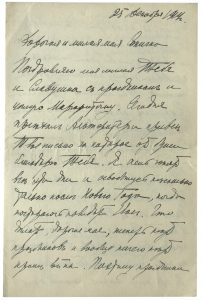 « Дорогая и милая моя Сонечка. Поздравляю моя милая тебя и Славушка с праздником и целую Маргариточку. Сегодня приехал А. и привез твое письмо, за которое от души благодарю тебя, я очень занят все эти дни и освобожусь только после Нового Года, тогда постараюсь повидать вас. Что делать, моя дорогая, теперь нет праздника и вообще ничего нет кроме войны. Поэтому праздники придется провести без меня. Я рад, что ты получила деньги за квартиру -все таки маленькая прибавка к тому немногому, что мы имеем. ты пишешь, что купила Славушке подарок-но он, повидимому, его не получил-надо устроить елку и порадовать его […] У нас не было елки, был только ужин после я долго сидел с Подурским у него в каюте. Сегодня отвратительная погода, сильная буря, все замерзает; но пора уже наступить холодам В эту зиму морозы начались очень поздно Думаю, скоро можно будет ходить на лыжах-я очень люблю это занятие и мне оно необходимо, т.к я редко схожу на берег и больше сижу и работаю не оставляя корабля […] ».