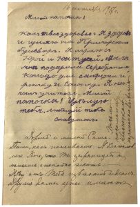 « Дорогой и милый Саша. Я благословляю Бога, что ты заграницей и можешь спокойно жить. Жду от тебя известия и денег. Другие дамы уже имеют письма от своих мужей. Мы со Славочкой ютимся у Ольги Васильевны Пусть привыкает к скромной жизни, лишь бы было самое главное […] Больше я газет не читаю и в политику не вхожу. Пусть хозяйничает в России, кто хочет. Не можем жить иначе, как на вере основывая жизнь. Верят в Керенского, как если бы он был Николай II. Надоело смотреть на людскую глупость Читаю английские романы, вышиваю от тебя жду писем Как никак худо ли хорошо прожили почти 13 лет вместе. Привычка интересоваться мужем осталась […] Надо надеятся, что американки еще не успели завладеть остатками твоего сердца, и для жены осталось хотя бы некоторое дружеское чувство […] ».