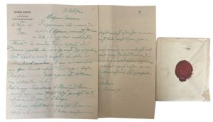 Важнейшее рукописное письмо Александра Колчака на бланка « верховного главнокомандующего » и « Верховного правителя » супруге и сыну, Омск, 20 октября 1919, 2 листа, 4 страницы, зеленые чернила, сохранен конверт с сургучной красной печатью, 15 x 12,5 см.