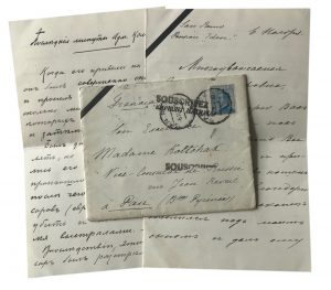 Важнейшее Письмо о последних минутах адмирала Колчака адресованное Софии Колчаком от некого С. Палавина (?), черные чернила с конвертом