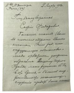 « Глубокоуважаемая София Федоровна, большое спасибо вам за теплые строки вашего письма. Очень рад, что окружающая обстановка и люди ответили должным образом вашему горю. Правда, мало русских в По, в это время, и большей торжественности печальному служению предать было нельзя. Здесь церковь была переполнена и были представители всех, кого следует иностранцев. То же было и Лондоне. С разных мест от нас запрашивают официального подтверждения случившегося, […] все основано пока на телеграмме английского офицера из Иркутска и передачах с чужих слов из Читы и из Пекина - и мы поэтому, отвечаем лишь, что здесь была отслужена официальная заупокойная служба […] Относительно вашего материального положения вам С. Д. Сазонов, вероятно, уже написал, что Делегацею было постановлено ассигновать на следующие три месяца ( 15 апреля -15 июля )опять такую же сумму 15 000 фр. Если не случится вообще особой какой катастрофы, эта цифра - 5000 в месяц удержится, конечно, и вперед […]