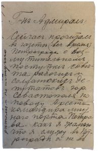 « Сейчас прочитал в газете ( вечернее время ) Петрограда о возмутительном поступке совета рабочих и солдатских депутатов города Севастополя по поводу ареста командира местного порта Петрова. Как я жалею, что я служу в Петрограде, а не в Севастополе. Я простой солдат, но сердце кровью обливается, читая про такие порядки на Руси. Я задаю иногда себе вопрос, почему временное правительство и командующие округами не откроют записи солдатов и офицеров хотя бы в какие -либо военные общества или лиги по призыву каковых […] были бы обязаны явиться в полное распоряжение Гг. офицеров, которые повели бы нас, именно навести порядок вплоть до применения расстрела вроде Ленина и ему подобных […] ».