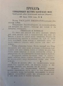 Приказ. Командующего флотом Балтийского моря. Свеаборгский рейд броненосный крейсер « Рюрик », 19 Июля 1914 года, № 2.