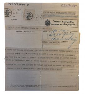 Telegramme envoyé de Petrograd à l'amiral Koltchak par l'Union des officiers de la flotte faisant part de leur soutien à l'amiral après les événements de Sébastopol et de sa destitution à la tête de la flotte de la mer Noire. 16 juin 1917.