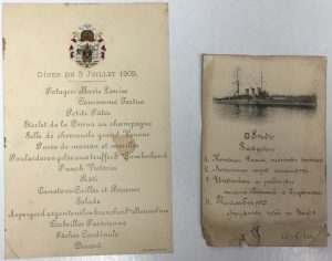 Deux menus: le premier à en-tête des armes impériales russes en l'honneur d'un dîner offert le 3 juillet 1909, imprimé par D. Semoukow, 8 rue Gogol, 20,7 x 13,6 cm.; le second avec un en-tête représentant le cuirasser Riurik en l'honneur d'un dîner offert le 30 novembre 1910, 16 x 10,5 cm.