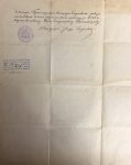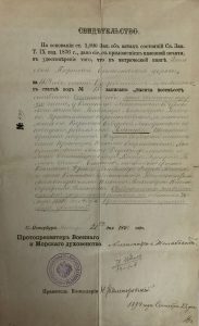 Certificat N°439 de baptême d'Alexandre Razvozov en date du 21 janvier 1892 avec le cachet et la signature du protopresbyte de l'armée et de la marine, le père Alexandre Zhelobovsky, et au revers l'enregistrement du dit acte auprès du notaire Joseph Stoungévitch à Kronstadt.