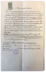 Рукописная метрическая выписка о крещении Ростислава Колчака, 25 июня 1910 года, № 155, город Юрьев Лифляндской губернии. Гербовая марка, печать Успенской церкви Рижской Епархии, подпись настоятеля и диакона.
