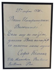 « Ваше Императорское Высочество! Если еще не поздно, умоляю, спасти моего мужа. София Колчак »