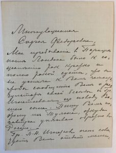 Рукописное письмо, адресованное Софье Федоровне Колчак от графини Софьи Владимировны Паниной, 24 августа 1919 год, Тулон, черные чернила. В письме говориться о содействии графа Игнатьева по поводу поступления сына в английскую школу.