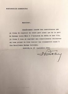 Lettre dactylographiée du Gouvernement Hongrois en date du 12 septembre 1942 faisant part de condoléances et demandant de transmettre ses salutations à Mme l'amirale Koltchak.