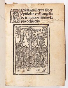 (*) Colophon : Guilhermi postilla super epistolas et euangelia per totius anni circulus currentia. Perq[ue] Joha[n]nem Schensperger Auguste impressa. Anno ab incarnat[i]onis salutisero milesimo quadringentesimo nonagesimoq[ua]rto. viii. kal[endas] februarij explicit feliciter.