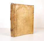 Reliure début XVIIème siècle vélin ivoire souple (salie, traces de lacets, 2nde charnière fendue et dos désolidarisé) - Dos lisse titré à l'encre (sali, assombri, 2 fentes en long, tranchefile supérieure détachée et détériorée) - Tranches bleutées -