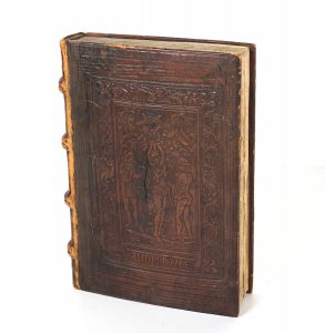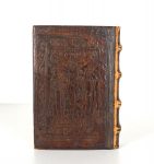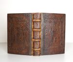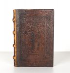 Double encadrement de roulettes, avec frise figurant des animaux fantastiques tels que des dragons, des entrelacs floraux, et des fleurs de lys angulaires, le tout encadré de nombreux filets à froid - Au plat supérieur (légèrement craquelé sur 4 cm), plaque figurant le martyre de saint Sébastien (Gid et Laffitte 1997, pl. 195, n° 20), au plat inférieur, plaque figurant la Crucifixion avec saint Thomas et sainte Catherine de Sienne (Gid et Laffitte 1997, pl. 67, n° 20) - Dos à nerfs XIXème siècle de basane rousse, orné de filets et de 5 fleurons à froid (nerfs, coiffes, coins et mors quelque peu frottés, fendillement de 2 cm en haut du mors du 2nd plat) - Annotation ancienne à l'encre en-tête.