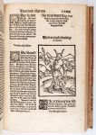 Titre imprimé à l'encre rouge et noire (sali) avec bordure de gravures sur bois représentant des putti, lettrines, débuts de certains paragraphes marqués par 1 gravure sur bois représentant 1 cloche de chapeau de fou, nombreuses gravures sur bois in texte, en partie celles utilisées pour l'illustration de La Nef des Fous de Sebastian Brant -
