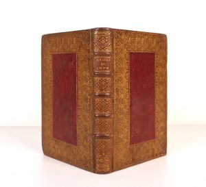 Reliure de l'époque maroquin fauve avec large dentelle dorée en encadrement, rectangle central mosaïqué en maroquin rouge (1 coin usé) - Dos à nerfs orné de petits fers filigranés - Dentelle intérieure dorée - Contre plats doublés de soie verte - Tranches dorées -