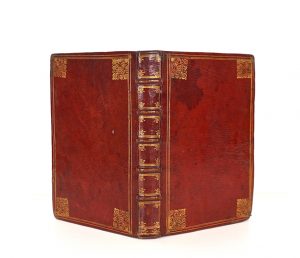 Reliure de l'époque maroquin rouge (2 coins frottés, 1 tache brune au 1er plat , 1 infime trou de ver au 2nd plat) - Triple filet doré encadrant les plats et grands fleurons dorés aux angles - Dos à nerfs muet orné de filets et de petits fleurons dorés - Roulettes dorées aux coupes et aux contre plats - Tranches dorées -
