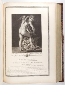 Titre gravé dans encadrement, 238 planches gravées sur cuivre (sur 352) par Couché, Varin, Prévost, Malaleuvre, etc., d'après Raphaël, Poussin, Van Dyck, Rubens, Rembrandt ou encore Le Caravage, sans la dédicace gravée au Duc d'Orléans -