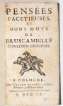 • A. Brölemann au 1er contre plat. Le comédien Deslauriers, surnommé Bruscambille, exerça à l'Hôtel de Bourgogne, l'un des principaux lieux de représentations théâtrales du XVIIe siècle. Il était fameux pour les propos souvent paradoxaux, inintelligibles ou dénués de sens dont il ponctuait les discours d'ouverture et de clôture du théâtre, comme il était d'usage alors. Les Pensées facetieuses sont l'un des deux recueils, avec Les Œuvres de Bruscambille, dans lesquels ces bouffonneries furent rassemblées.