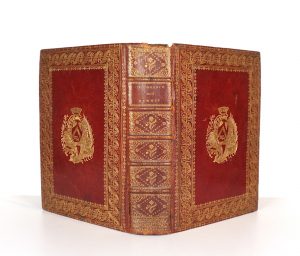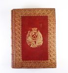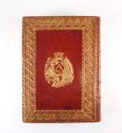 Reliure de l'époque maroquin rouge aux armes dorées non identifiées (1er mors fendu sur 10 cm, le 2nd sur 8 cm, coins et coupes frottés, 3 griffures mineures et 1 très petit trou provenant d'1 choc au 1er plat) - Large dentelle encadrant les plats - Double filet aux coupes - Dentelle intérieure - Dos à nerfs orné (coiffe supérieure accidentée) - Tranches dorées -