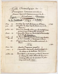 Table chronologique des principaux événemens arrivés en France depuis le commencement de la Révolution feuillets du 4 mai 1789 au 1er octobre 1801 (79 feuillets), puis : 3 feuillets d'anecdotes de cette période de l'histoire, puis :