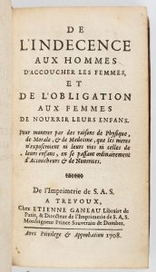 [MÉDECINE] - [HECQUET (Philippe)] - De l'indécence aux hommes d'accoucher les femmes, et de l'obligation aux femmes de nourrir leurs enfans. Pour montrer par des raisons de physique, de morale, & de médecine, que les mères n'exposeroient ni leurs...