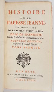 Traduction française par Jacques Lenfant avec des annotations et des ajouts d'Alphonse des Vignoles. Elle parut initialement en 1694. Théologien et historien hollandais auquel on doit d'importants travaux sur l'histoire ecclésiale, Friedrich Spanheim (1632-1701), dit le Jeune, s'est attaché ici à rassembler de nombreux documents anciens émanant d'auteurs religieux et profanes afin d'établir l'existence de ce personnage féminin ayant, selon la légende, occupé au IXe siècle le trône de Pierre en tenant cachée sa condition de femme.