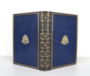 Reliure de l'époque chagrin bleu nuit signée L. Guétant - Plats encadrés d'1 triple filet doré aux armes centrales d'Arthür Brölemann "d'argent, à la bande d'azur bordée d'or, accompagnée de deux fleurs de myosotis tigées et feuillées au naturel" - Coupes ornées d'1 double filet et large dentelle intérieure - 1ère couverture conservée - Dos à nerfs richement orné titré et daté or - Tête dorée -