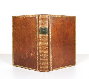 Reliure de l'époque basane havane marbrée (mors et parties de coupes frottées, 1 coin usé, petites rayures aux plats) - Dentelle encadrant les plats - Roulette aux coupes - Dos lisse orné de fleurons et de filets (quelque peu frotté) - Pièce de titre maroquin vert - Tranches marbrées -