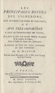 MAUPIN. Les principales bévues des vignerons, aux environs de Paris et partout, ou avis très important à tous les propriétaires des vignes, pour servir de suite à la nouvelle méthode de planter la vigne... à l’usage de tous les pays,...