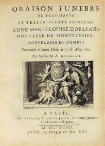ANSELME (Messire M.A.). ORAISON FUNEBRE DE TRES-HAUTE ET TRES-PUISSANTE ANNE MARIE LOUISE D'ORLEANS, DUCHESSE DE MONTPENSIER, souveraine des Dombes. Paris, Josse, 1693. In-4° de 51-[1] pages, maroquin noir, filets dorés avec fleuron d'angle, tranches dorées (reliure postérieure). Edition originale de l'oraison funèbre prononcée à Saint Denis le 7 Mai 1693. Vignettes par Audran. Petit manque sur le premier plat.