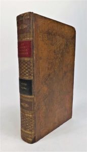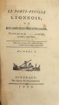 [BRUYSSET DE MANEVIEUX]. LE PORTE-FEUILLE LYONNOIS ou bigarrures provinciales, trouvées par un Q......, ni cuirassé, ni mitré, mais botté. Minorque (Lyon), aux dépens du gouvernement, 1779-80. 2 numéros de 6-208-[2] et 6-147-[1] pages, basane racinée, dos lisse orné (reliure de l'époque). Les 2 seuls numéros parus. A l'instar d'un journal, l'auteur raconte les faits divers et anecdotes lyonnaises : Choix d'un emplacement pour un cimetière, observations sur le canal de Givors, sur les suicides, l'assassinat d'un colporteur, un mémoire sur la conservation des enfants,... Charnières intérieures consolidées, cernes en fin de volume. (Barbier II, 956).