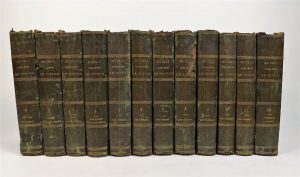 BUFFON. OUVRES COMPLETES. Paris, Garnier (1855). 12 volumes in-8, demi basane verte, dos lisse (reliure de l'époque). Nouvelle édition illustrée de très nombreuses planches d'après Traviès et « coloriées avec le plus grand soin ». Reliures abimées, rousseurs.