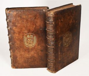 BULLART (Isaac). ACADEMIE DES SCIENCES ET DES ARTS, contenant les Vies, & les Eloges Historiques des Hommes Illustres... Avec leurs Pourtraits tirez sur des Originaux au naturel, Brusselle, chez François Foppens, 1695. 2 volumes in-folio de [14 (l'errata placé au milieu du volume)]-421-[2] et [12]-501-[3] pages, veau brun, armes dorées sur les plats, dos à nerfs orné (reliure de l'époque). Remarquable collection de 274 PORTRAITS BIEN GRAVES, en partie par N. de Larmessin, d'après les meilleures sources dont Holbein, Van Dyck,... Bullart travailla trente ans à cet ouvrage qui fut publié par son fils. On trouve tous les grands personnages représentés, les humanistes, les navigateurs, les savants, les poètes, les imprimeurs et tous les artistes classés par école. Défauts aux reliures, quelques cahiers roussis, les derniers feuillets sont renforcés dans les marges. 2 feuillets de texte manquants, déchirure à une page sans manque, les portraits sont bien complets. EXEMPLAIRE PORTANT LES ARMES DE L'ABBAYE DE MAIZIERES, avec la devise Maceriae. C'est l'une des plus anciennes abbayes, établie au XII° siècle.
