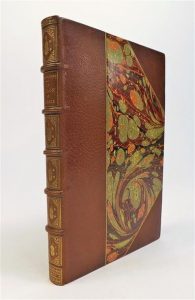 CHAMPFLEURY. LE VIOLON DE FAIENCE. Paris, Conquet, 1885. In-12, demi-maroquin acajou à coins, dos à nerfs orné de violons dorés, tête dorée, couvertures bleues conservées, non rogné (Champs). Edition finement illustrée par JULES ADELINE elle se compose de 2 eaux-fortes hors-texte, 31 in-texte et 2 sur la couverture. Tirage unique à 500 exemplaires, celui-ci numéroté sur velin du Marais. Petites salissures à la reliure, sinon bon exemplaire relié par Victor Champs, bien complet du prospectus du libraire. (Vicaire II, 194).