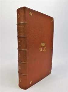 COUSIN (V). LA JEUNESSE DE MAZARIN. Paris, Didier et Cie, 1865. In-8, maroquin Lavallière, plats ornés des initiales dorées A de L, surmontées d'une couronne, fleurons dorés aux angles, dos à nerfs orné, dentelles intérieures, tranches dorées (Petit). Jolie reliure monogrammée A. de L. (Alphonse de Lamartine ?) en maroquin de Petit. Rousseurs intérieures.