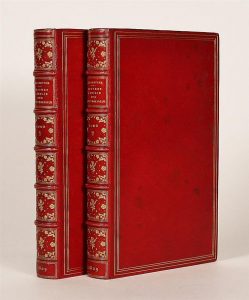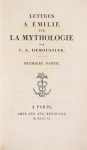 DEMOUSTIER (Charles-Albert). LETTRES A ÉMILIE SUR LA MYTHOLOGIE. Paris, Renouard, 1809. 6 parties reliées en 2 volumes in-12, maroquin rouge, triple filet doré sur les plats, dos à nerfs richement orné, dentelle dorée intérieure, tranches dorées sur marbrure. (R. Petit). Fameuse édition ornée d'un portrait gravé par Gaucher d'après Ducreux et de 36 figures hors texte par MOREAU, sur velin fort et gravées par les meilleurs artistes. Légères rousseurs sans gravité. MAGNIFIQUE EXEMPLAIRE EN MAROQUIN SIGNE DE R. PETIT.