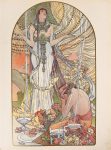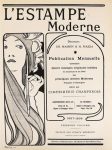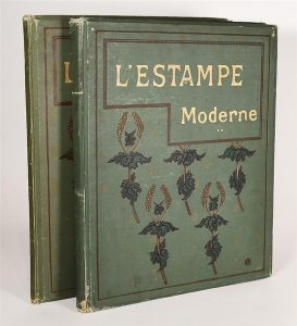 ESTAMPE MODERNE (L'). Paris, Imprimerie Champenois, 1897 à 1899. 2 volumes in folio, percaline verte illustrée de l'éditeur. L'Estampe Moderne se voulait représentative des diverses tendances artistiques de son époque, elle fut fondée par l'éditeur Henri Piazza et par Charles Masson, futur directeur du musée de Luxembourg. C'est l'une des publications illustrées les plus emblématiques de l'Art Nouveau dans laquelle tous les plus grands illustrateurs de la fin du 19ème siècle sont représentés avec des estampes inédites, réservées pour l'ouvrage. Chaque lithographie porte le cachet à froid de l'Estampe Moderne et est protégée d'une serpente sur laquelle figure un poème ou texte d'un auteur célèbre en lien avec l'image. Exemplaire bien complet des 4 planches de « prime » réservées aux abonnés d'un an, comportant 99 (sur100) lithographies et impressions en noir et en couleurs, toutes montées sur onglet. La planche de Paul Leroy, la joueuse d'osselets est manquante. Un dos accidenté, petites usures en haut et bas des dos.