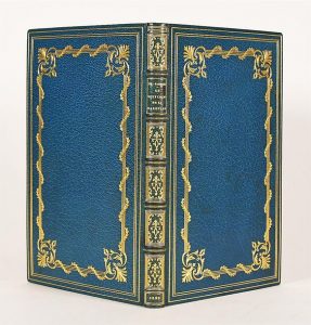 GAUTIER (Théophile). LE PETIT CHIEN DE LA MARQUISE. Paris, L. Conquet, 1893. In-12, maroquin bleu-vert, plats richement ornés de filets et dentelles dorées, dentelle intérieure dorée, dos à nerfs orné, tranches dorées, couvertures conservées (Marius Michel). Charmant livret illustré de 21 dessins dans le texte par Louis Morin. L'un des 150 exemplaires de tête sur vélin blanc avec les gravures aquarellées et un tirage à part sur Chine en noir. Quelques rousseurs. ELEGANTE RELIURE DU MAITRE-RELIEUR MARIUS MICHEL.