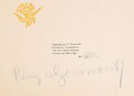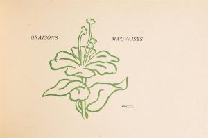 GOURMONT (Remy de). ORAISONS MAUVAISES. Paris, Mercure de France, 1900. In-16 oblong, broché, couvertures avec décor floral gaufré et doré sur fond vert amande. (Reliure de l'époque). Edition originale très rare. Elle est ornée à chaque page d'une délicate composition florale en couleurs (vert ou ocre) par Georges d'Espagnat. Tirage limité à 97 exemplaires, celui-ci n° 1 SUR JAPON, justifié et signé au crayon bleu par l'auteur.